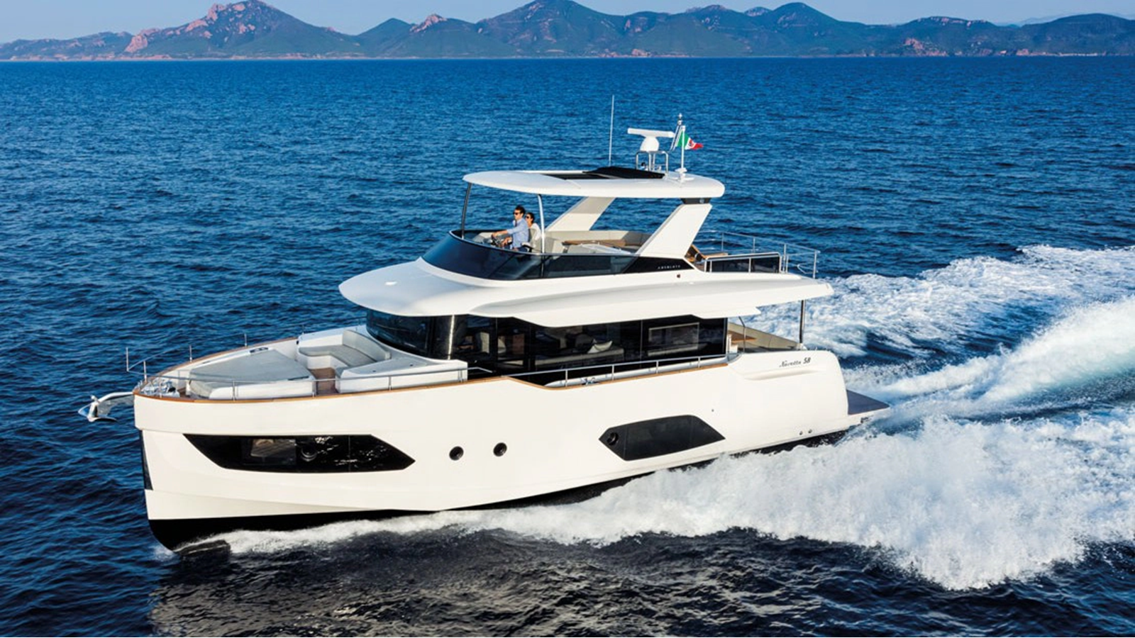 Her exterior design is thoughtfully laid out: wide side decks with secure handrails, a protected terrace on the upper deck, and sun loungers on the flybridge and bow.
